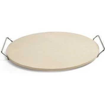 Easy to handle sturdy stainless steel frame. Unglazed ceramic stone is 15 in. diameter, 0.4 in. thick. 16 in. x 15 in. x 1.5 in. overall dimensions.